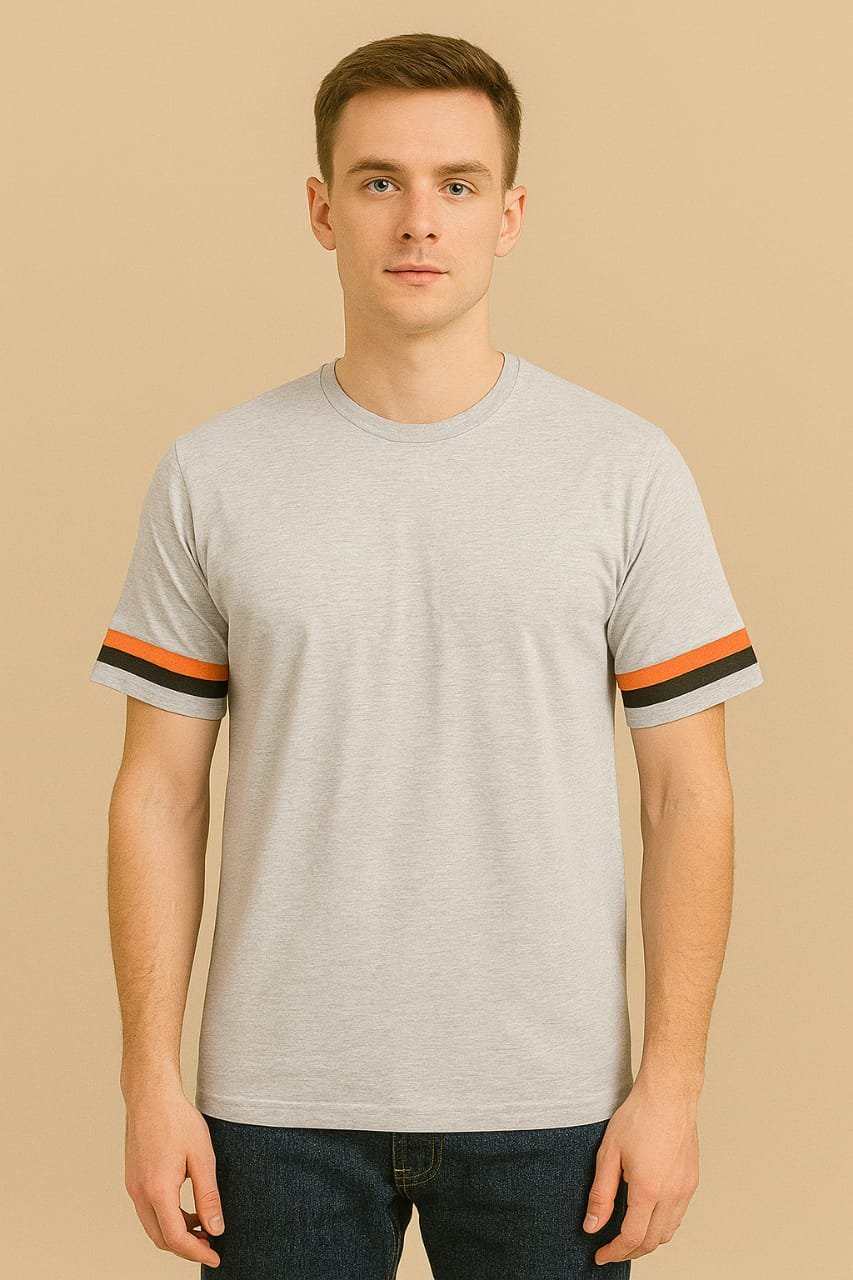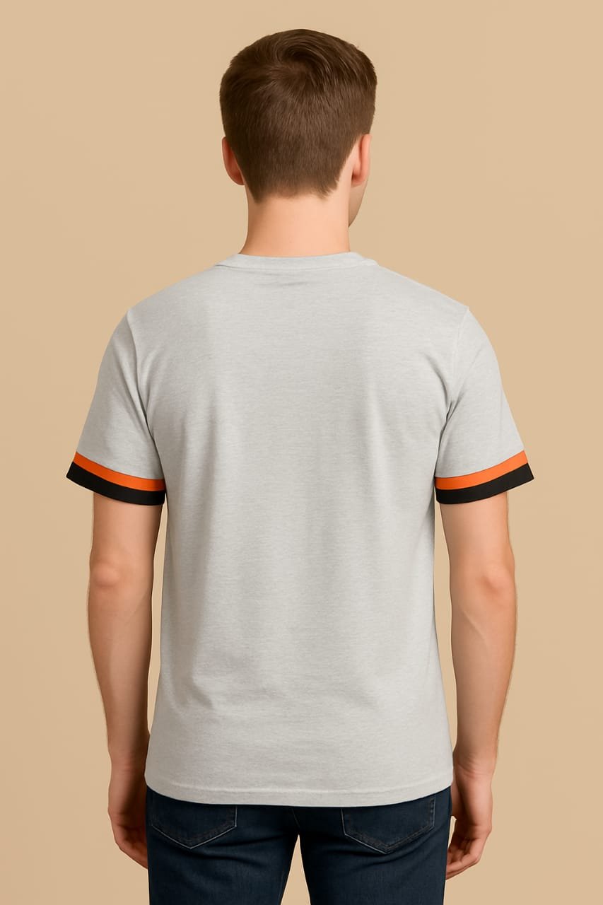 The unique orange and black sleeve stripes add a modern twist, giving you a distinctive edge while keeping things understated. Whether paired with jeans, chinos, or shorts, this grey lakra t-shirt for men is a wardrobe essential you’ll reach for again and again.