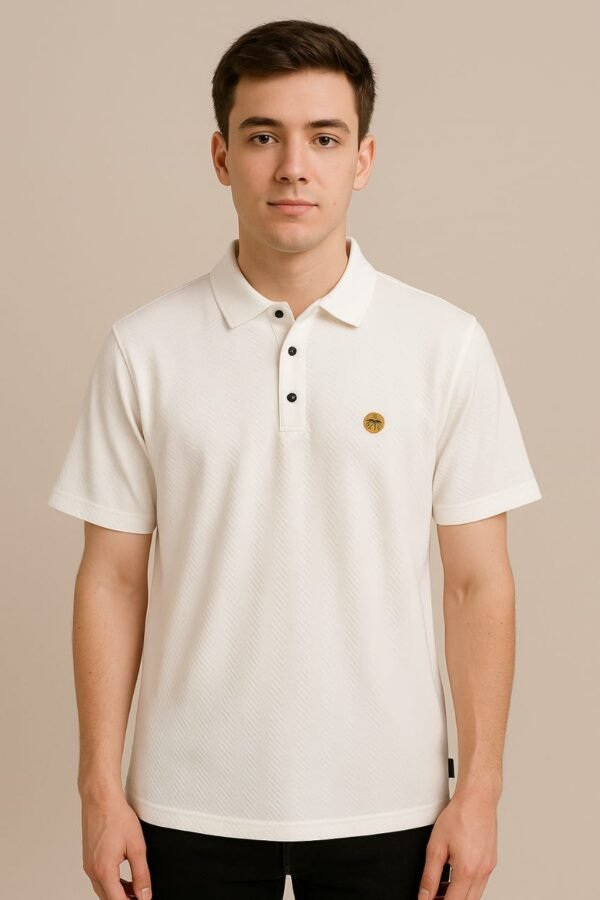 The timeless design features a classic collar, three-button placket, and a subtle diagonal stripe pattern, adding understated elegance. A small gold emblem on the chest adds a touch of premium class.